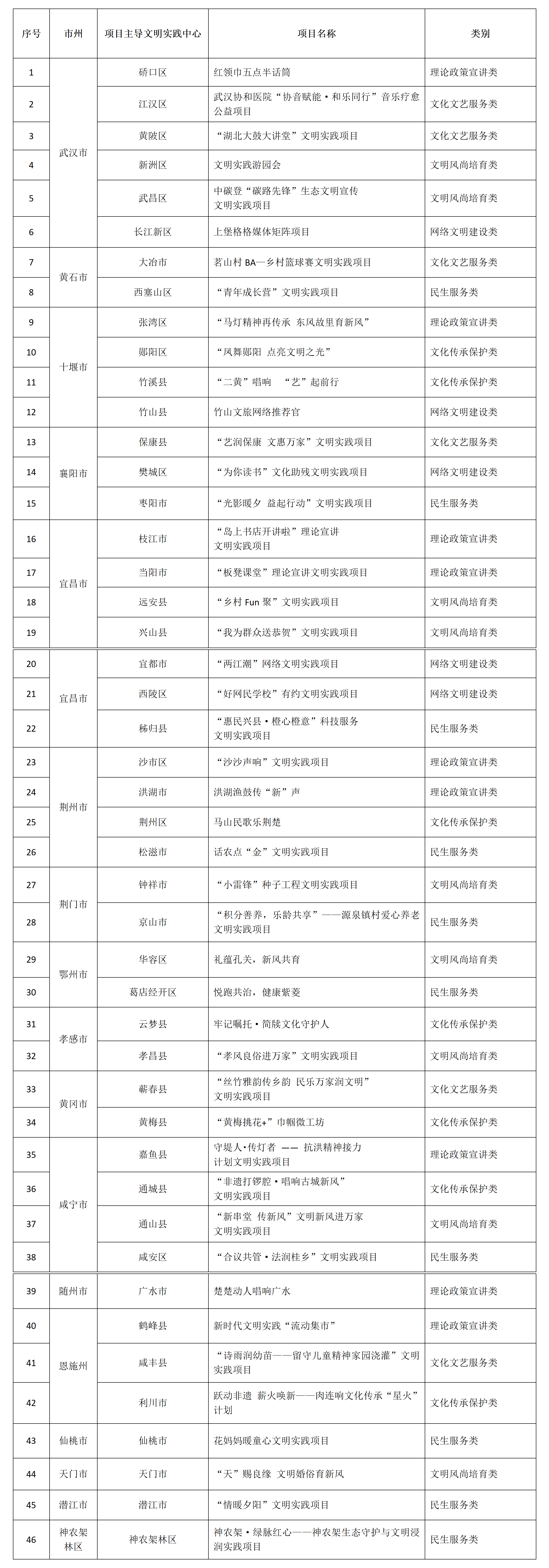 为进一步发挥新时代文明实践项目对建强用好新时代文明实践中心的支撑作用,更好凝聚加快建成中部地区崛起重要战略支点强大精神力量,持续打造“文明实践 情满荆楚”品牌,各县(市、区)新时代文明实践中心聚焦文明实践重点工作内容和群众所思所想所盼,着力夯实项目基础,加强策划、设计和组织实施,培育了一批融入高质量发展、助力基层治理,扎根基层、服务群众的文明实践项目。经各市州文明办申报、省文明办审核,127个文明实践项目纳入省级项目库,46个重点项目进入全省线上交流展示环节。现通过湖北文明网,对进入交流展示环节项目名单予以公示,接受社会各界监督。如果对入选项目资质有异议,可在公示期内通过邮件、电话、传真等方式,向省文明办反映。