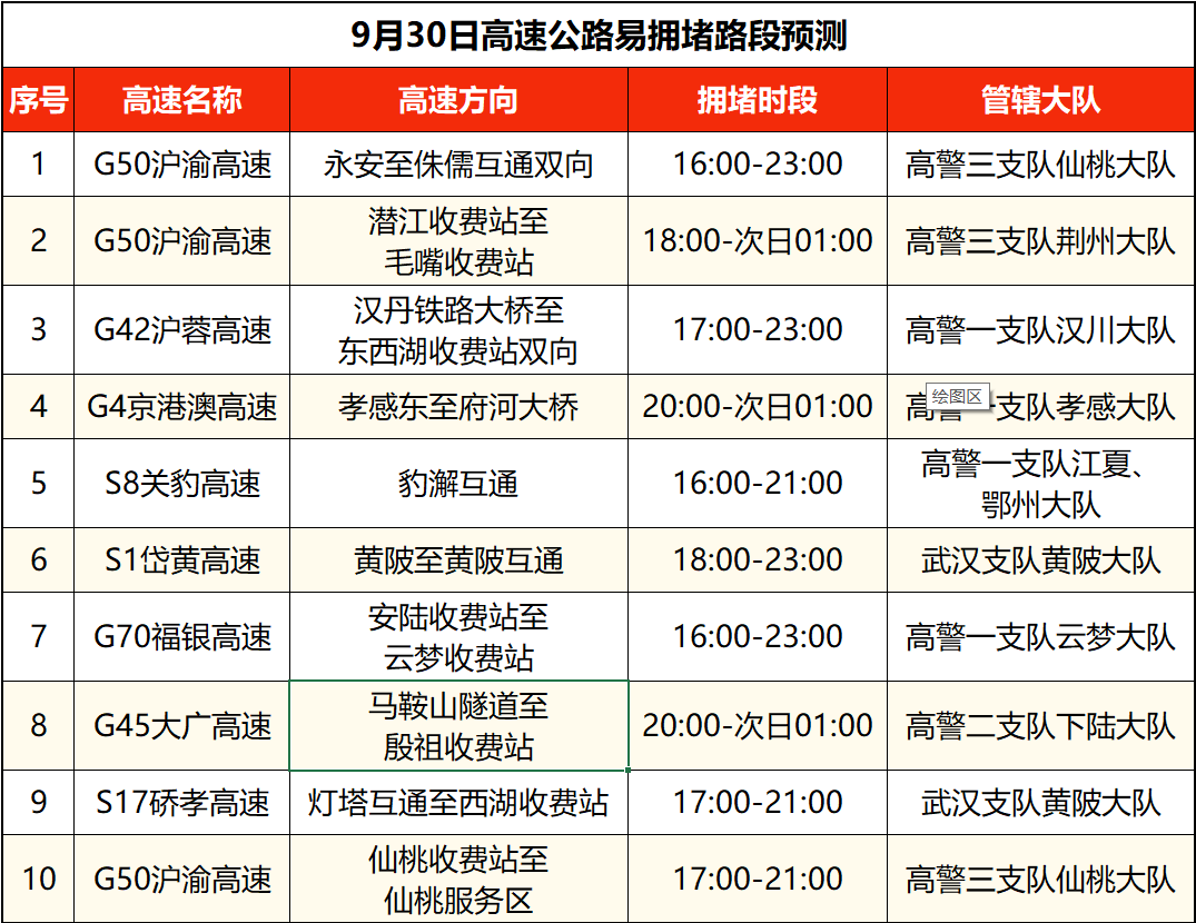 结合近年假期出行规律,9月30日部分群众选择提前出行,路网流量提前进入高位,预计16时起车流量将逐渐增长,以武汉及各市州为中心向周边县市发散。