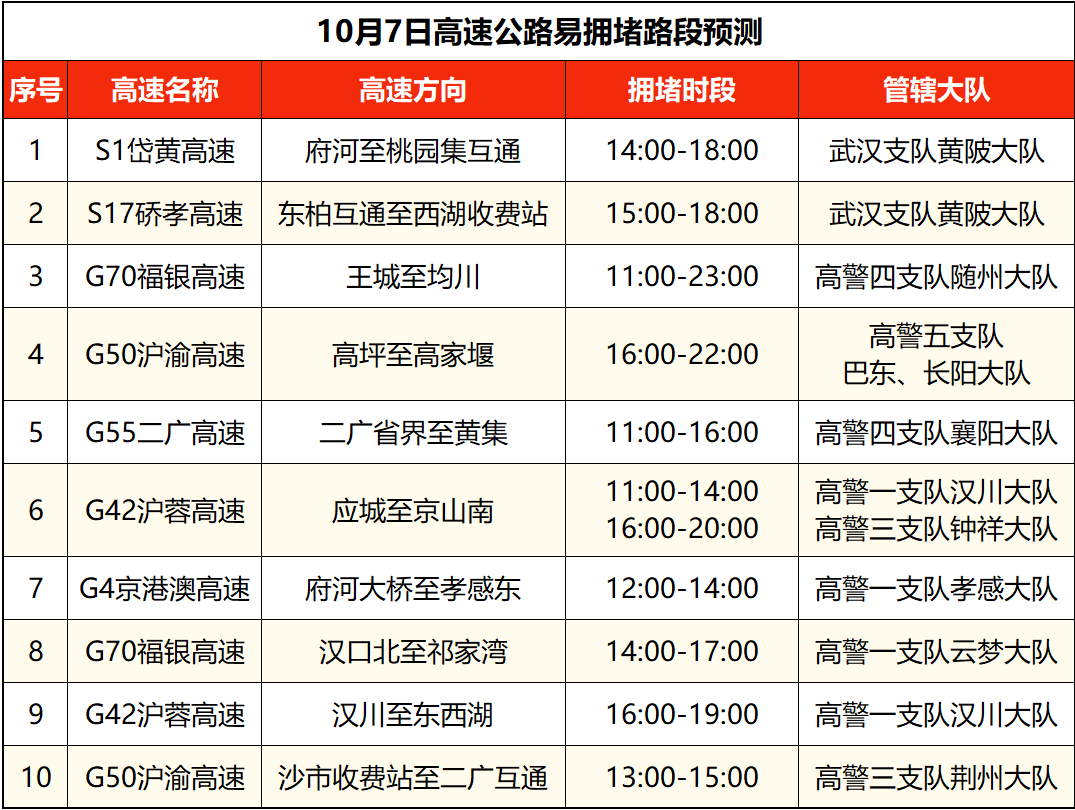 沪蓉高速汉川、当阳、钟祥、黄陂段,沪渝高速仙桃、荆州、长阳、黄石、巴东、鄂州、恩施段,福银高速云梦、随州、十堰段,京港澳高速孝感段,武鄂高速鄂州段,武汉绕城高速江夏、蔡甸段,武监高速武汉段,沪武高速江岸段,二广高速襄阳段,呼北高速十堰段等高速路段拥堵风险高。