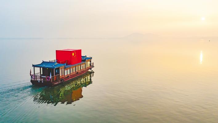 9月28日清晨,在武汉东湖凌波门,以一艘载着巨幅国旗的游船为首,由十余艘帆船、游船等组成的船队驶向曙光。(湖北日报全媒记者 何宇欣 通讯员 高梦雅 摄)