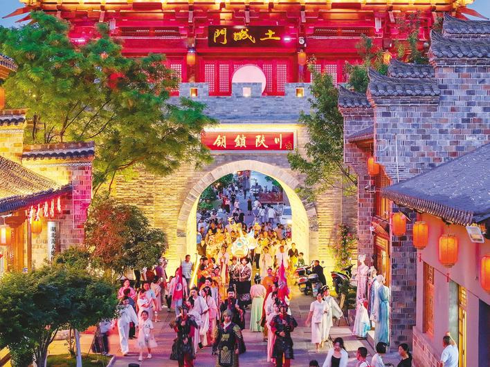 湖北夜间文旅消费集聚区将在假期推出各类特色夜游活动。图为房县西关印象的汉服游园活动现场。(景区供图)