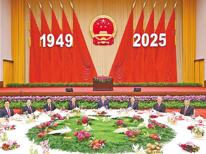 人民大会堂宴会厅华灯璀璨,洋溢着喜庆热烈的节日氛围。主席台上方高悬着庄严的国徽,“1949—2025”大字年号在鲜艳红旗映衬下格外醒目。