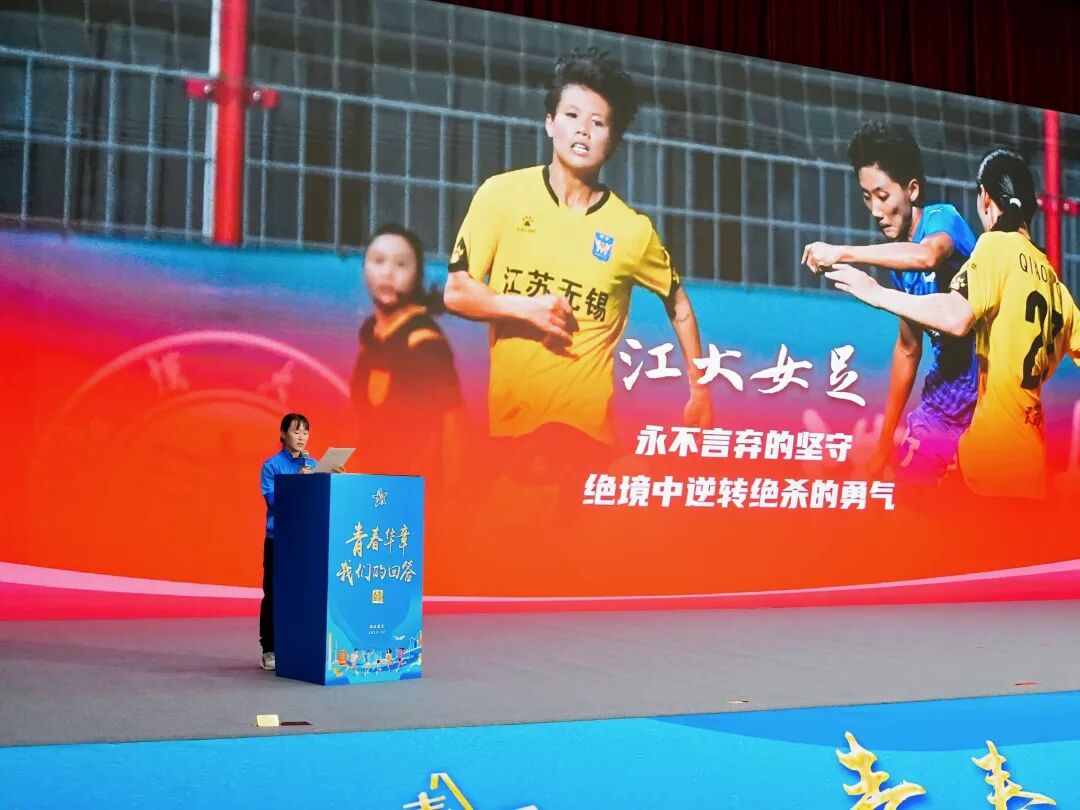 中国女足运动员王霜通过视频与同学们分享了她23年足球生涯的感悟:“找到自己热爱、并愿意为之拼搏的事情,就不要害怕困难,不必畏惧失败,努力向前、敢于拼搏,总有一天,会绽放出绚丽的青春之花。”