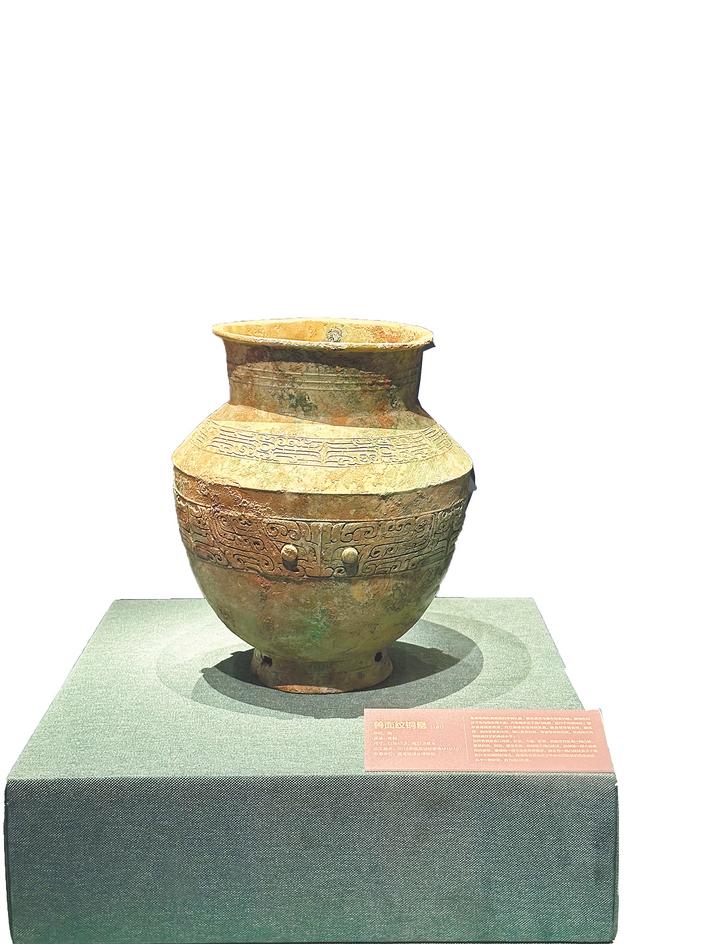 展览中,一组出自盘龙城遗址的由鼎、觚、爵、斝、簋组成的青铜礼器,在器物组合和形制上与中原高度一致,勾勒出“长江流域早期青铜文明中心”盘龙城昔日的辉煌,也是黄河与长江文明不断交流融合的实证。