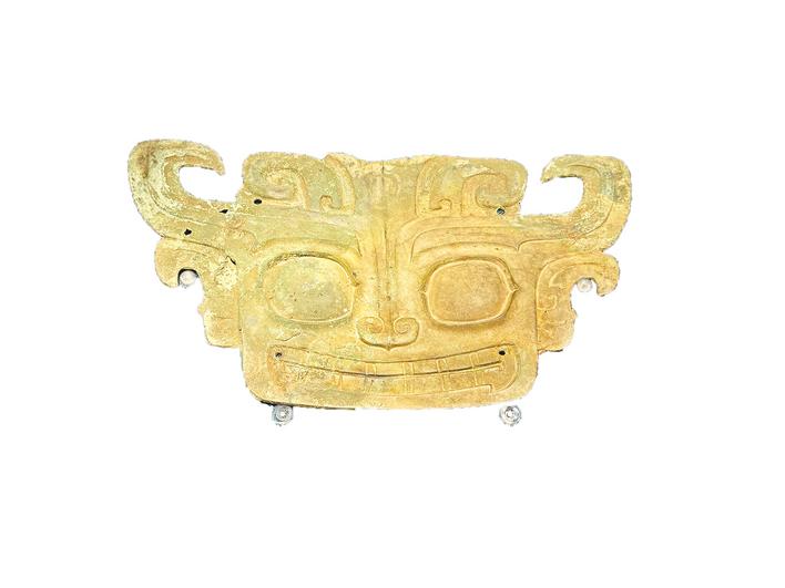 青铜面具是三星堆青铜文化中十分特殊的一类器物,或庄严肃穆,或神秘诡谲,代表着古蜀人独特的艺术审美和巫术文化。这些面具在铸造时充分运用了写实和夸张的手法,高鼻、阔嘴、立眼,构成了人神相通的奇特图像,给人雄浑庄重的感觉。仔细观察面具,可以发现它的耳边和额头部位都有方孔,在浇铸时就已经提前预留,有学者认为方孔的用途是安装和固定面具。