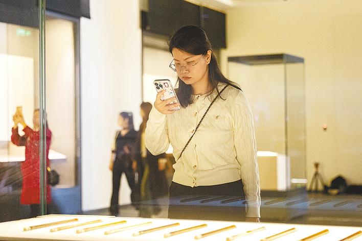 观众在简牍展品前驻足拍照。 (湖北日报全媒记者 何宇欣 摄)