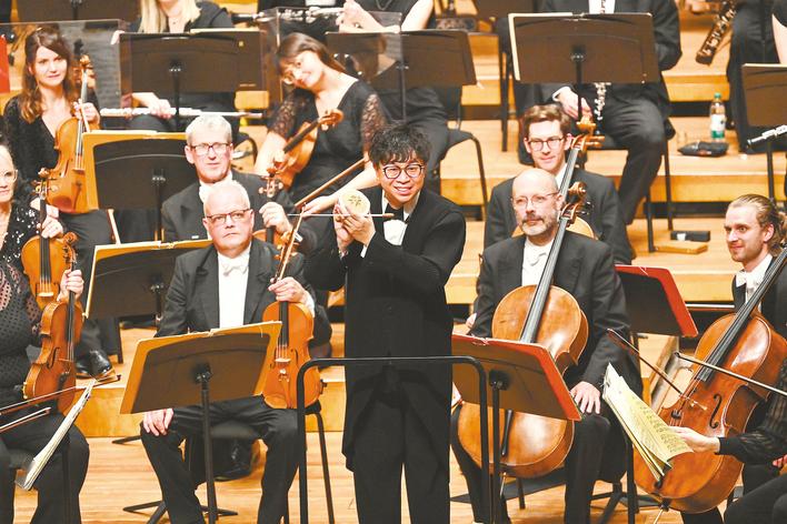 演出尾声,黄佳俊手持热干面玩偶向观众致意,引发全场雷鸣般的掌声。这位曾于2017年在武汉一天连吃四碗热干面的指挥家介绍:“武汉这座城市的独特魅力让我难忘,琴台‘知音’文化所传递的温暖与音乐的力量不谋而合。”