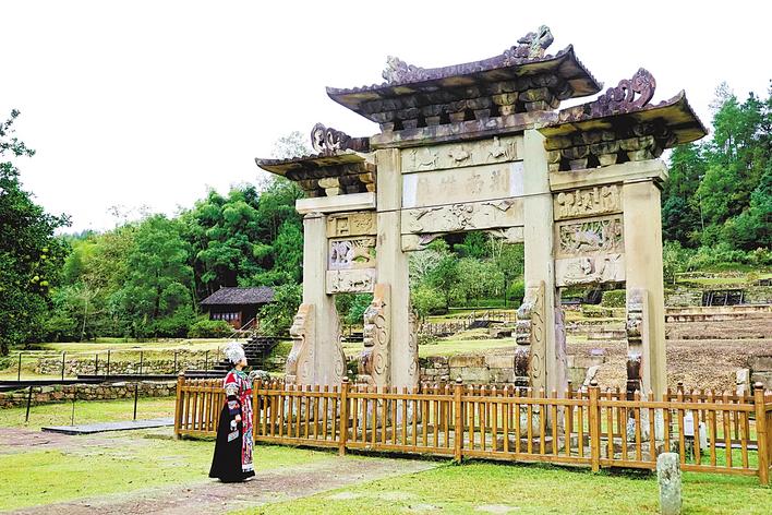 这座牌坊始建于明天启四年(1624年),通高7.15米、面阔8.4米,以四柱三门、双重屋檐的规制,矗立于衙署建筑群中轴线起点。它不仅是唐崖土司城址的标志性建筑,更是现存土司遗址中等级最高、体量最大的礼制性建筑。