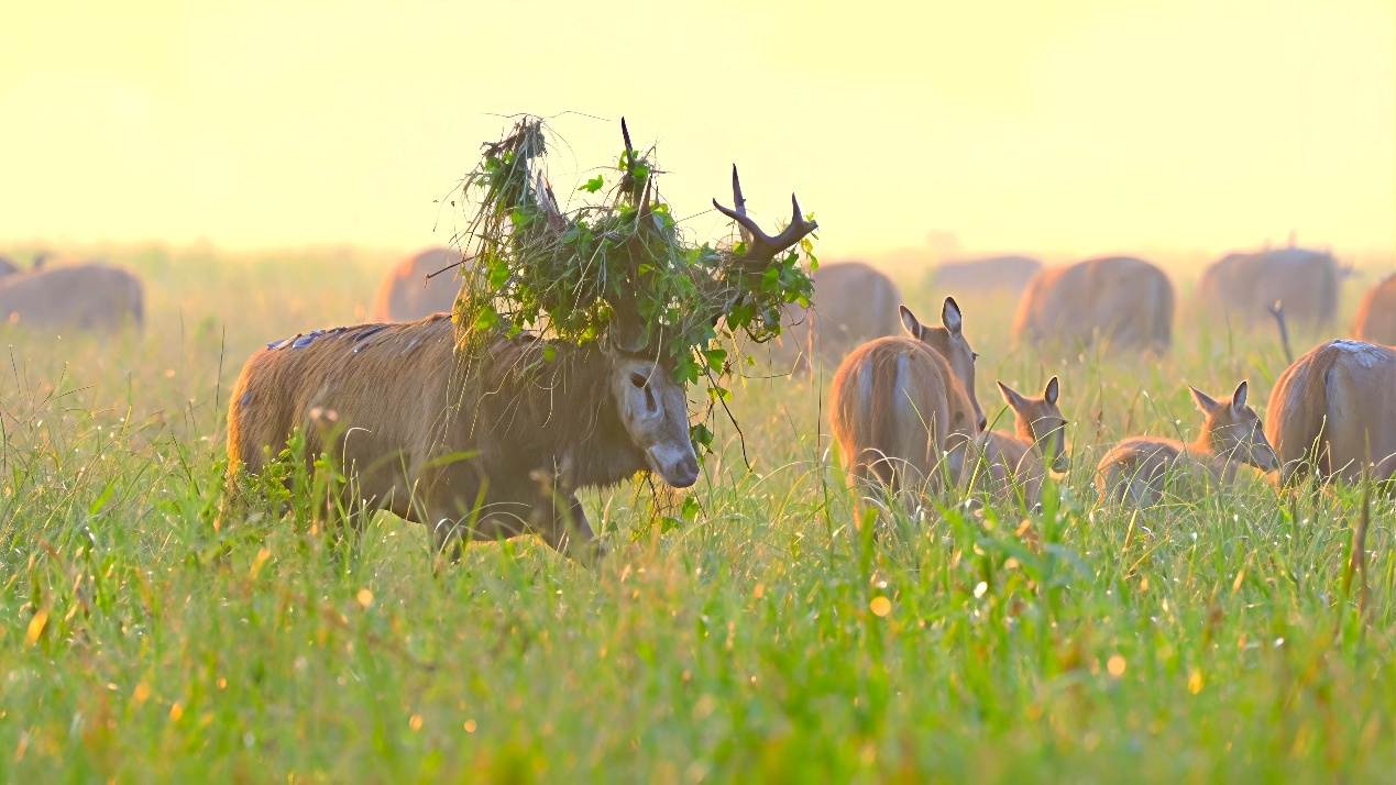 湖北石首,长江故道蜿蜒而过。清晨,麋鹿在鸟鸣中苏醒。这里是它们恢复野性的天堂,也是科技与情感交织的守护之地。