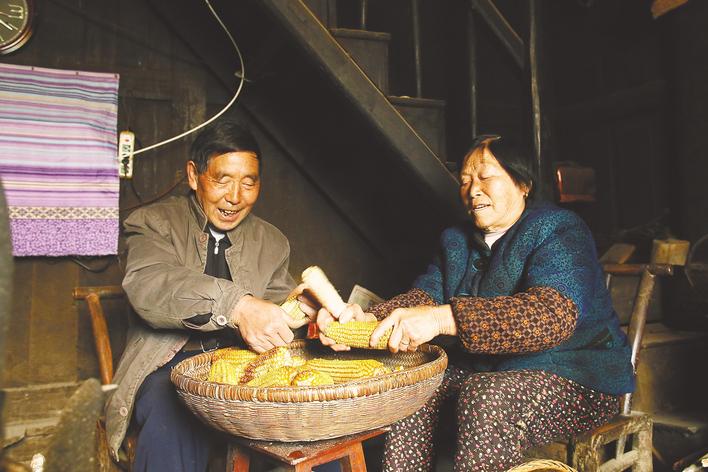 罗官章和妻子掰玉米。(湖北日报通讯员 严晓冬 摄)
