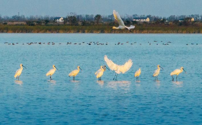 武汉沉湖湿地自然保护区,国家二级重点保护动物白琵鹭在水面栖息。(湖北日报全媒记者 柯皓 摄)