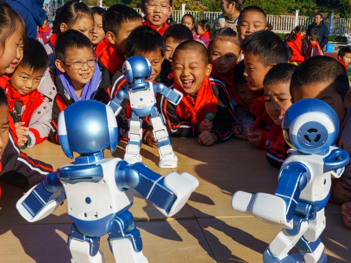 县科协科普大篷车同步进驻校园,带来多样互动科普展品。多台智能机器人随着音乐节奏舞动,手臂灵活摆动、机身精准旋转;机器狗憨态可掬,在工作人员指令下精准完成“坐下”“握手”“转圈”等动作;孩子们围在台前睁大眼睛,踮脚探头,不时抬手欢呼鼓掌,满脸惊喜与兴奋,久久不愿挪步。