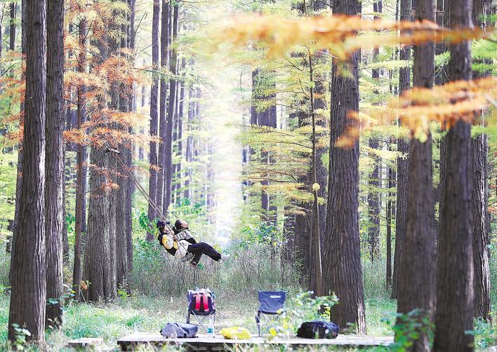 11月22日,游客在京山市太子山国家森林公园游玩。初冬时节,暖阳映照下,百亩林海层林尽染,宛若一幅巨型油画。近年来,京山市精心构建四季旅游体系,通过持续推进生态价值转化,绘就一幅人与自然和谐共生的生态画卷。 (视界网 赵平 摄)