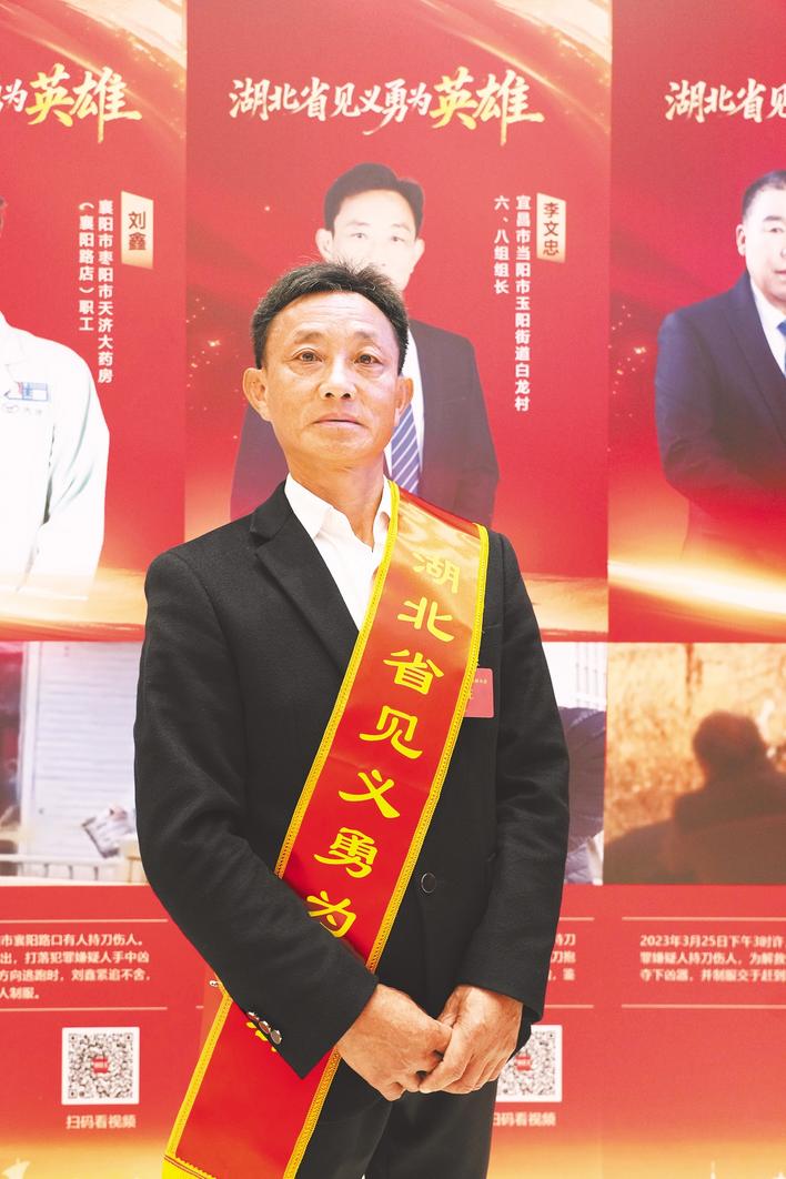 今年60岁的李文忠,中共党员,当阳市玉阳街道白龙村六组和八组组长。2023年1月21日,李文忠和家人正在家中准备年夜饭,突然接到李某家发生矛盾纠纷的电话,他迅速赶往李家屋场。袁某因见不到女儿(袁某已离婚,其女儿被判给了女方)导致情绪激动而持刀滋事,李文忠好言劝解,袁某的情绪慢慢缓和下来。这时,袁某前岳父李某从外面回来,二人再次发生口角,袁某情绪失控,挥刀朝李某刺去。危急时刻,李文忠不顾自身安危,用身体挡住袁某,不幸被刺中受伤,胳膊、肺部、胃部连中三刀,李文忠仍死死抱住凶徒直至被制服,重伤的他历经26天抢救才脱险。李文忠的挺身而出,让李某及其家人免受伤害。