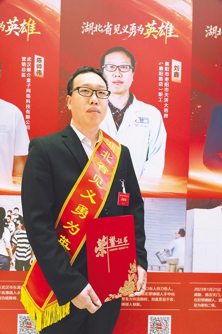 刘鑫是枣阳市天济大药房的一名职工。2023年8月17日早上,他和往常一样在药房抓药,突然听到店外传来急促的呼救声:“快报警,砍人了!”他立刻冲出门,看到不远处一名男子正手持菜刀疯狂地对一名女子施暴,鲜血流了一地,情况万分危急。