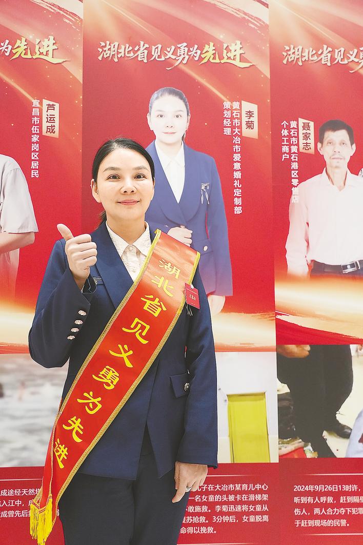 湖北日报讯 (记者周寿江、李娅晶、通讯员黄子宸)“我在黄金救援时间内,把孩子救回来了。作为一名母亲,我感到很自豪。”11月28日,湖北省见义勇为英雄先进表彰大会上,43岁的大冶市爱意婚礼定制部策划经理李菊,被授予“湖北省见义勇为先进”称号,她作为受表彰代表上台发言时说。