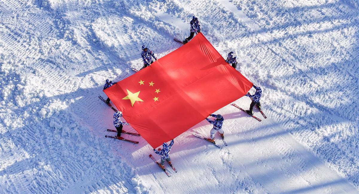 12月28日,位于保康县的横冲国际滑雪场开板,千余名游客畅享冰雪乐趣。图为滑雪爱好者手持巨幅国旗滑行。(湖北日报全媒记者 赵怡然 摄)