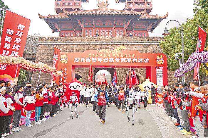 12月30日,第18届湖北省新年登高全民健身活动在武汉东湖磨山风景区举行。两台人形机器人化身“活力陪走员”,成为现场瞩目的科技明星。(湖北日报全媒记者 童军鹏 何旭峰 通讯员 邱亚娟 摄)