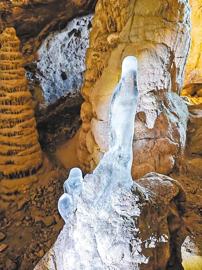 走进山洞,只见洞口长着几根晶莹剔透的冰柱。与其他地方冰柱不同,这些冰柱很圆润,像玉石一样从土里冒出来。“洞口气温低,有风,水从上面滴下来,慢慢凝结成了冰柱。”钟林说。