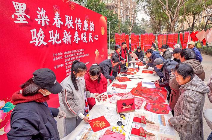 红纸铺开,墨香四溢。1月17日上午,武汉市洪山区洪山街道景江社区027小区小广场上,“墨染春联传廉韵 骏驰新春暖民心”新春送福活动热闹开场,为即将到来的马年春节增添了浓浓的年味。活动现场,书画创作者们凝神静气,挥毫泼墨,免费供社区居民挑选。
