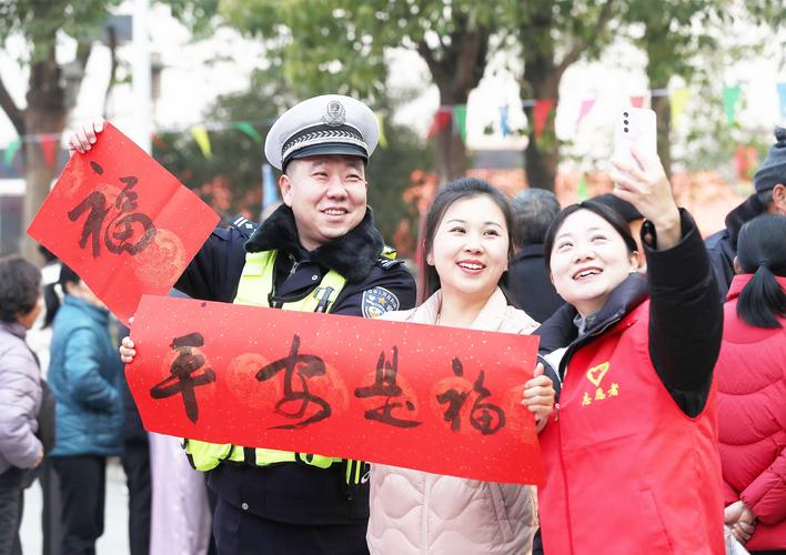 日前,荆门市东宝区仙居乡年货大集热闹开集。集市上,当地交警开展“送春联话平安”主题活动,将交通安全宣传融入传统年俗,为群众送上美好的平安祝愿。(农村新报 通讯员 赵平 谈媛媛 摄)