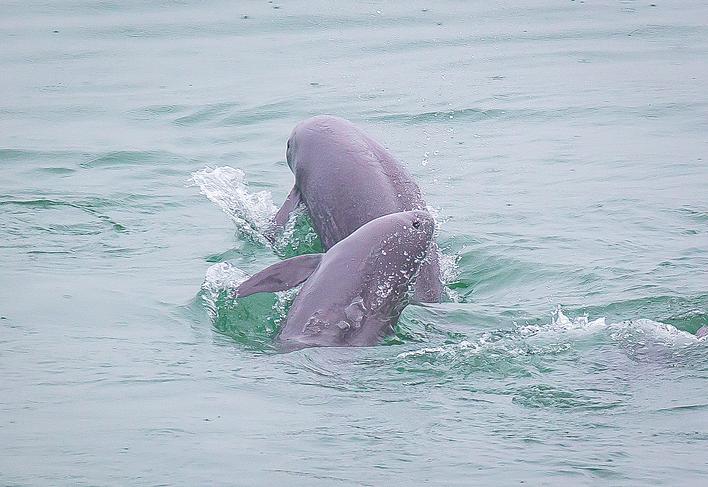 在湖北省宜昌市江边,长江江豚在水中嬉戏(2021年5月10日摄)。