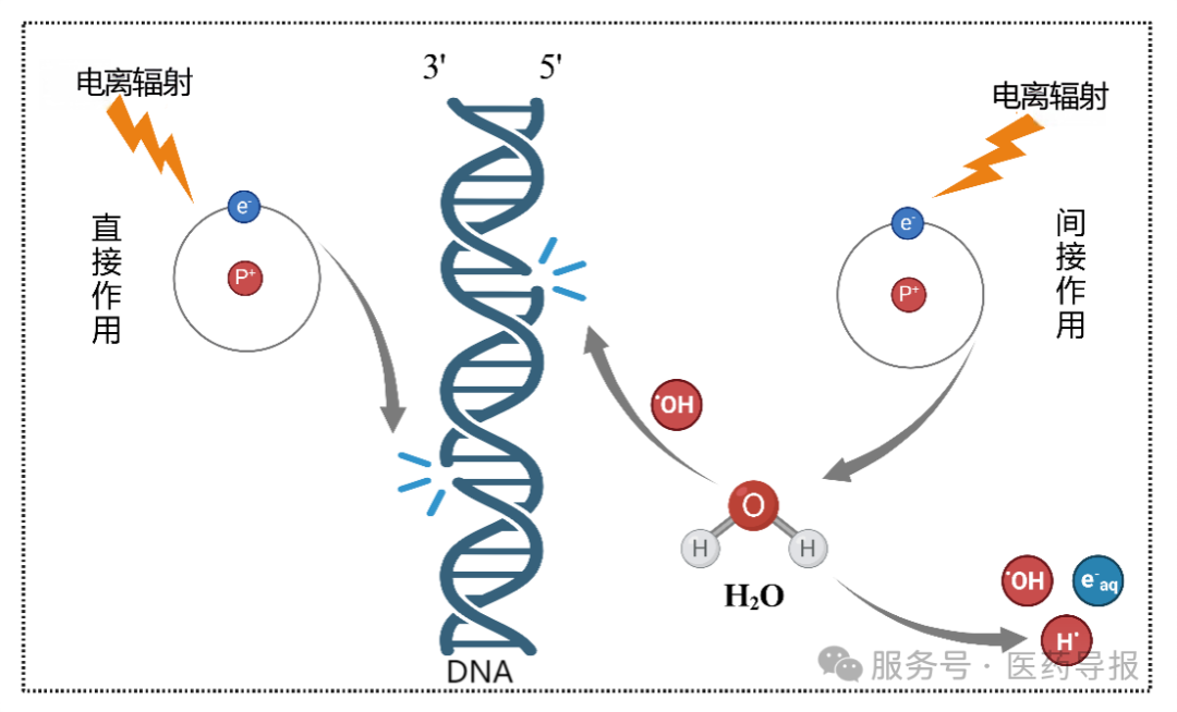 简单来说,辐射就是能量的传播方式,要么像光、无线电那样,以“波”的形式传播/扩散,要么像电子、质子那样以“粒子”的形式穿梭。根据能量高低和能否改变物质结构,辐射可分为两大“阵营”,一类叫非电离辐射,能量较低,不能打破原子结构(没法把原子里的电子“拽”出来),我们日常接触的大部分辐射都属于此类,如红外线、紫外线、微波炉的微波、手机信号等,对人体的身体健康影响不大;另一类叫电离辐射,波长较短,能量较高,通过直接作用或间接作用(图2)“拆散” 原子(让电子脱离原子),可能破坏细胞DNA分子结构。我们常说的“放射”“核辐射”主要指的就是这一类,比如医院检查用的X射线、核反应里的α粒子、β粒子、中子等。