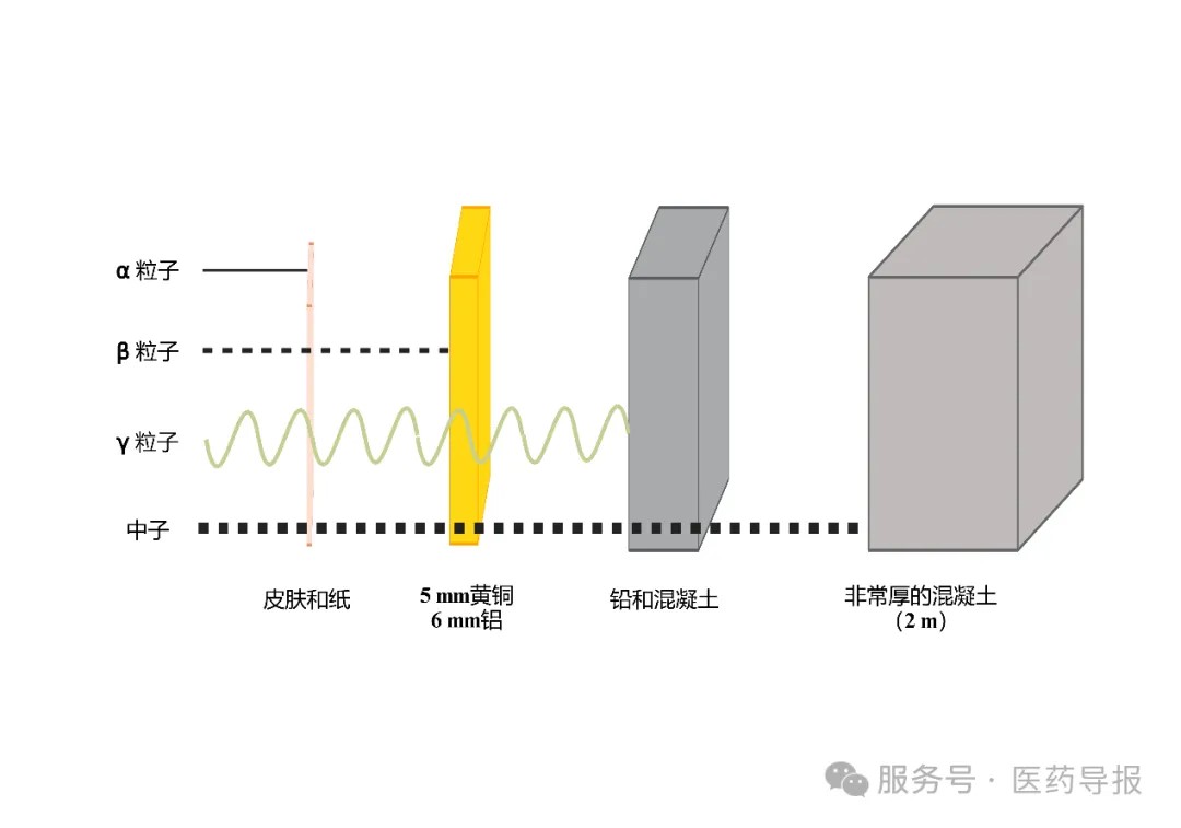 挡:距离防护 + 屏蔽防护。因为辐射强度随距离增加呈“平方反比”衰减(距离翻倍,强度降至 1/4),所以远离辐射源是最简单直接的有效的防护(如操作X射线机器时,技师在隔室控制;核设施周围设置安全距离等)。屏蔽防护即在人与辐射源之间放置阻挡物。不同粒子的穿透能力不同(图3),需要使用不同的屏蔽材料:铅板、混凝土墙能有效阻挡X/γ射线;塑料或铝板可阻挡β粒子;含氢材料(如水、石蜡)可慢化中子。
