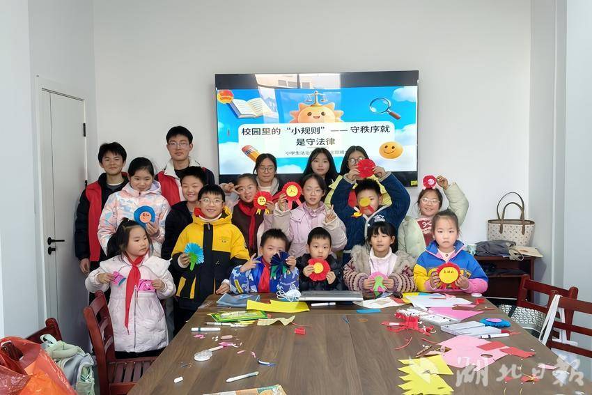 红色教育与法治启蒙轮番上阵。城郊街道跑马场社区的志愿者为孩子们讲述抗美援朝英雄事迹,让大家在感动中厚植爱国情怀。“致敬最可爱的人”奖章手工活动中,孩子们用彩纸、彩笔寄托对革命先辈的崇敬。法治安全教育课则聚焦“校园小规则与法律”,志愿者通过情景模拟、案例分析及卡片承诺书创作,让孩子们树立规则意识与法治观念。