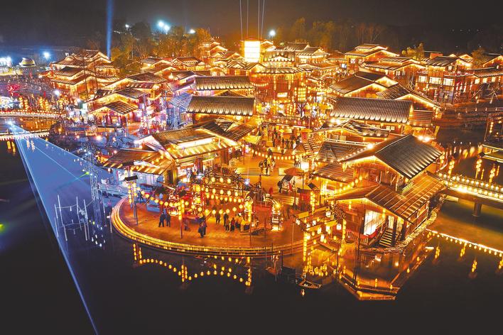 2月7日,武汉江夏里老码头灯火璀璨,文化美食街区人潮涌动,首届码头潮玩庙会火热进行中。本次庙会将持续至3月3日,一站式融合年俗、夜游与消费,成为武汉新春文旅消费新地标。(湖北日报全媒记者 陈少哲 摄)