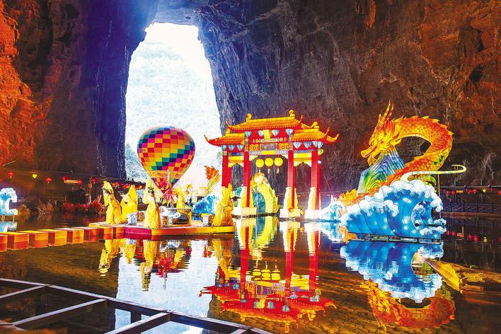 腾龙洞龙形灯组与水中倒影交织。(湖北日报通讯员 陈小林 摄)