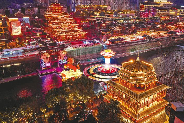 夜幕降临,宣恩县城浸润在一片温暖的灯火中。贡水河两岸,上万盏彩灯渐次点亮,灯光映照河面,波光粼粼,勾勒出一幅诗意夜游画卷,如同将“天宫”搬来了。“外婆快看,仙女飞起来了!”六岁的李蕊兴奋地指着河面说。光影之中,7位身着飘逸衣裙的“仙女”立于“福气莲莲灯”上翩然起舞,引来岸边游客连连赞叹。牵着外孙女的田桂香老人笑逐颜开:“如今过年真有气氛,灯都跑到水里了,还会‘跳舞’呢!”