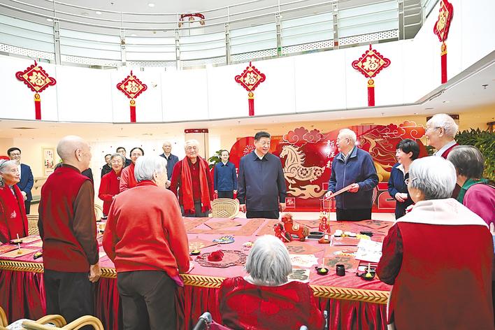在银龄老年公寓,习近平详细了解老年人健康检查、康复训练、日常起居照料等情况。大厅里,一些老人正在写春联和福字,习近平来到他们中间,欣赏他们的创作,勉励他们老骥伏枥、老有所为,祝他们健康长寿、春节快乐。