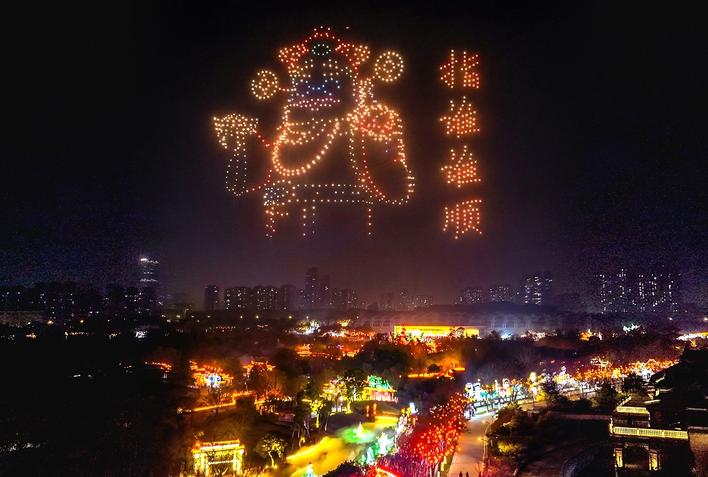 11日喜庆过小年。武汉园博园花灯会游人如织,仰望夜空有大戏:千台无人机在空中为大家送上新春祝福画卷。