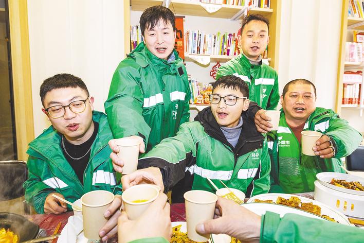在武汉市武昌区户部巷社区服务驿站里,外卖小哥们围坐在一起,吃上了社区专门准备的团年饭。(湖北日报全媒记者 何宇欣 通讯员 冯露敏 王书娴 摄)