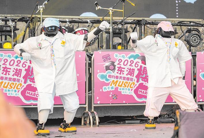 樱花园建筑外墙也披上樱花主题彩绘,变身网红打卡点;湖心岛、曲院樱艳等点位上演沉浸式歌舞、器乐表演,“凤舞九天”演艺增添祥瑞之气;热干面乐队、汉派音乐领军人物冯翔领衔的春日音乐会,以及飞越丛林持续整个樱花季的森林音乐会,让花香与歌声交织,尽显春日雅韵。