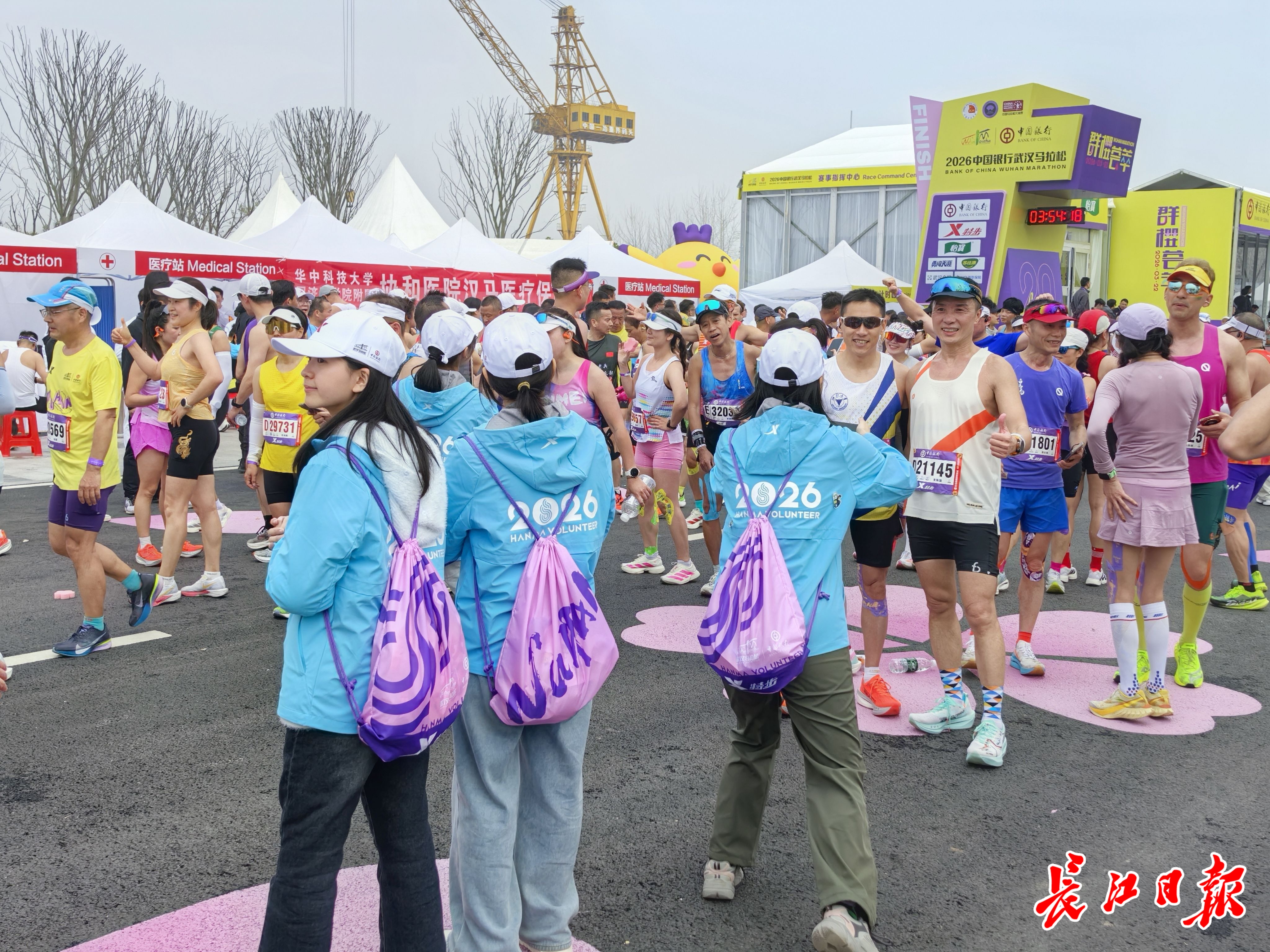 22日上午10时许,2026武汉马拉松全马终点青山江滩,完赛选手陆续冲线。樱花相伴的赛道旁,志愿者列队鼓掌、热情致意:“恭喜完赛!辛苦啦!”跑友们笑着击掌道谢,纷纷请志愿者帮忙拍照留念,一幕幕暖心互动,勾勒出本届汉马最美的文明风景线。