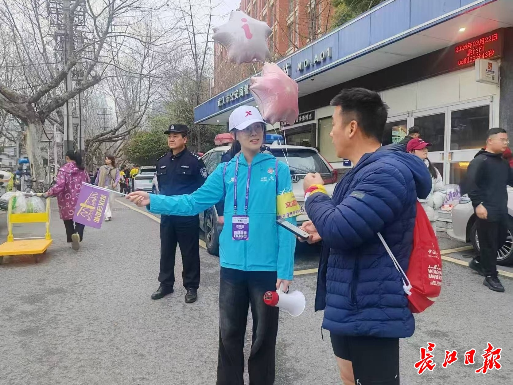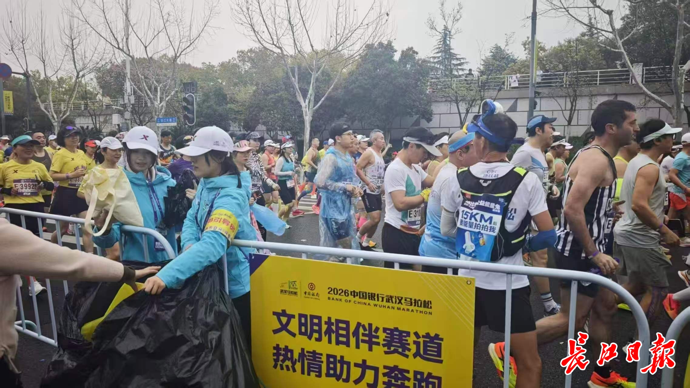 武汉马拉松江岸赛段,志愿者热心服务。记者汪洋 摄