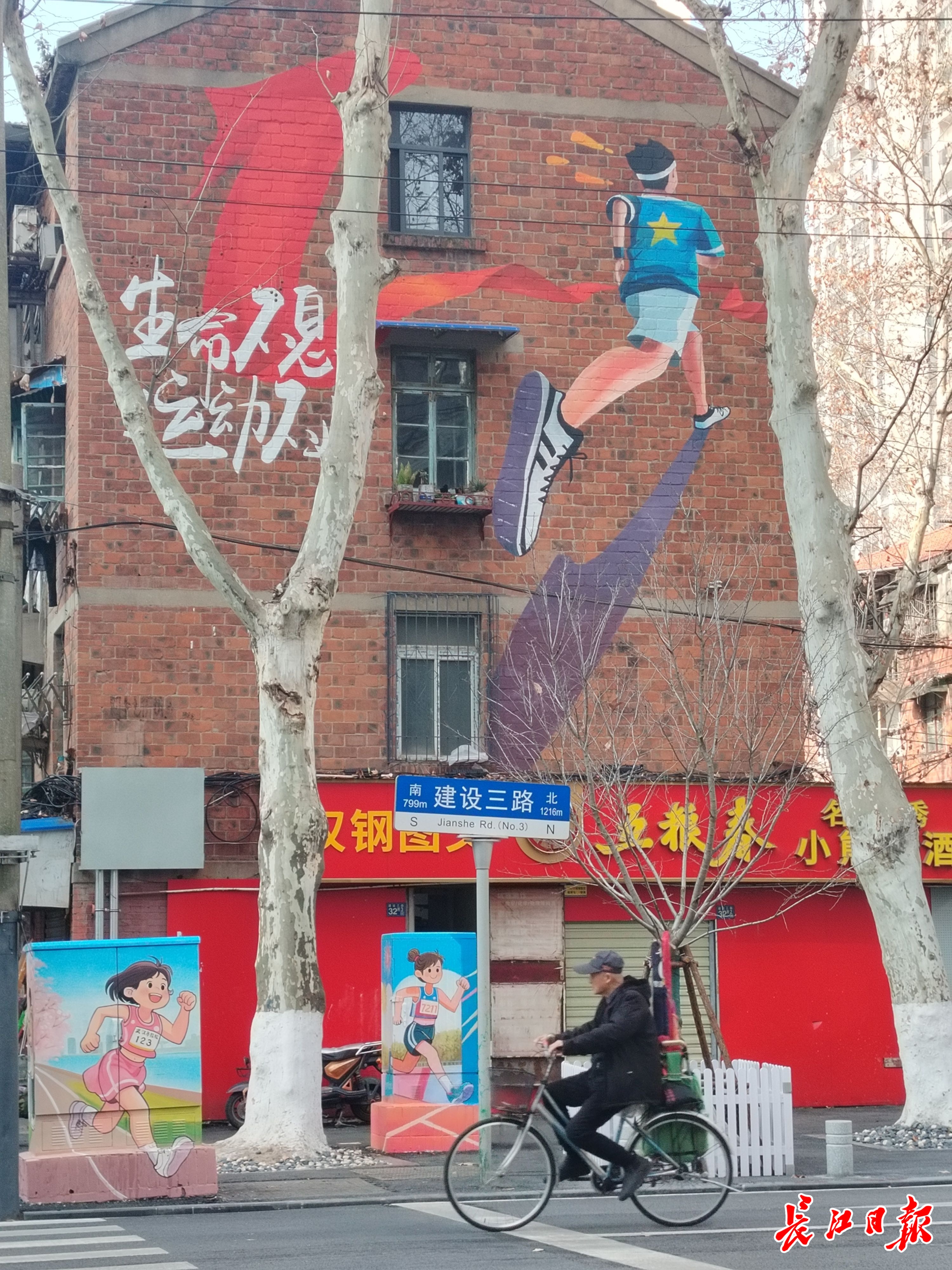借着汉马举办的契机,社区从环境整治难点入手,逐一拆除违章搭建的吊脚楼,将杂乱裸露的管线用银灰色铝板规整包覆,彻底清理卫生死角。更独具匠心的是,社区将原本不起眼的老旧红砖墙,打造成了特色文明彩绘长廊,奔跑的运动员、盛开的樱花、醒目的“青山”字样等图案跃然墙上,就连街边的配电箱也披上了春日彩绘“新装”。