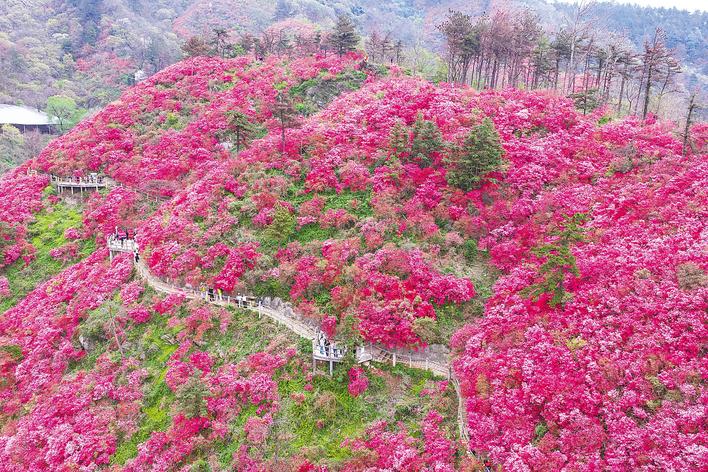4月2日,武汉黄陂云雾山万亩野生杜鹃进入盛花期,花宇山、花海等核心赏花点漫山红遍,蔚为壮观。作为华中规模最大的野生杜鹃群落,云雾山多个品种将梯次开放,赏花期长达50天。(湖北日报全媒记者 倪娜 通讯员 黄宣 摄)