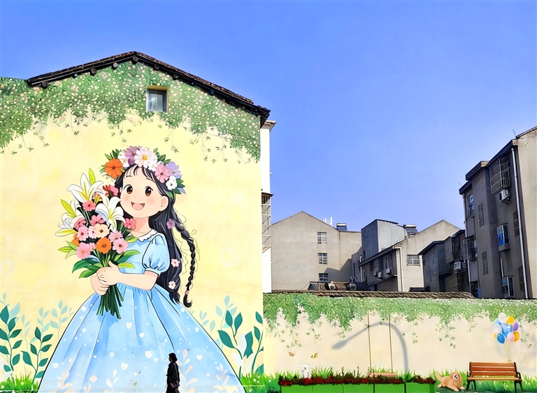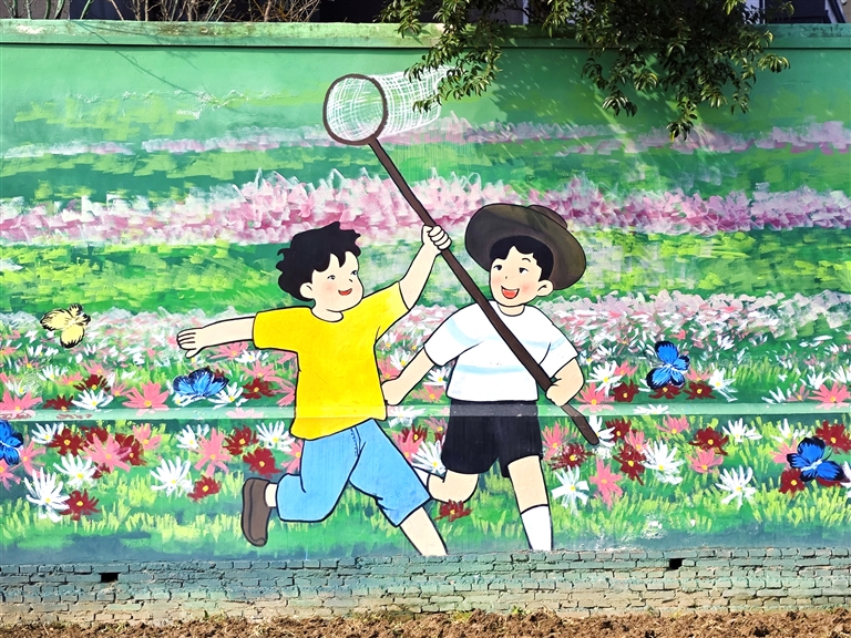 棉原社区都市华府小区东侧的墙绘上,孩童花间嬉戏,天真烂漫。