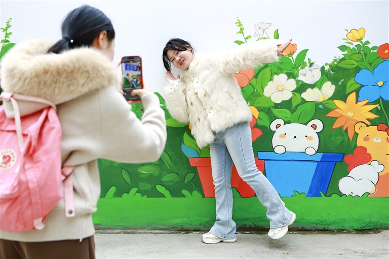 “孩子每天放学都要带着同学们来拍照,还跟同学炫耀‘这是我们小区的墙’。”居民蔡明霞笑着说,以前墙面单调,孩子放学也没个好玩的去处,如今,孩子们围在墙前指认图案、嬉笑打闹,小区里也多了几分烟火气。
