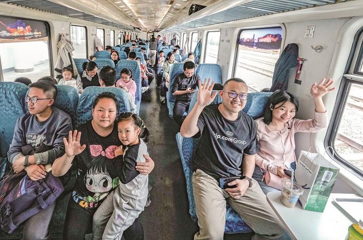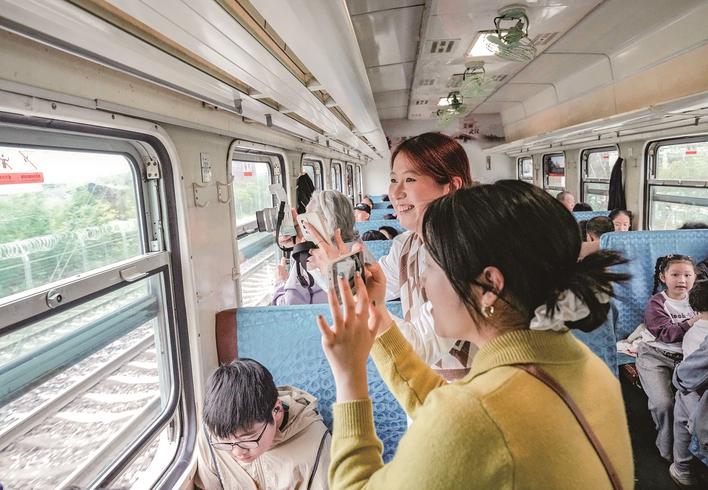 4月5日,“武汉东至武汉东”环线列车车厢内人气堪比春运,这趟6元的“春日火车”引爆了武汉清明假日文旅市场。为满足游客需求,4月8日起,武铁“汉口-汉口”环线列车上线,现已开始售票。(楚天都市报极目新闻记者李辉 通讯员胡谨怡 郭向泽摄影报道)