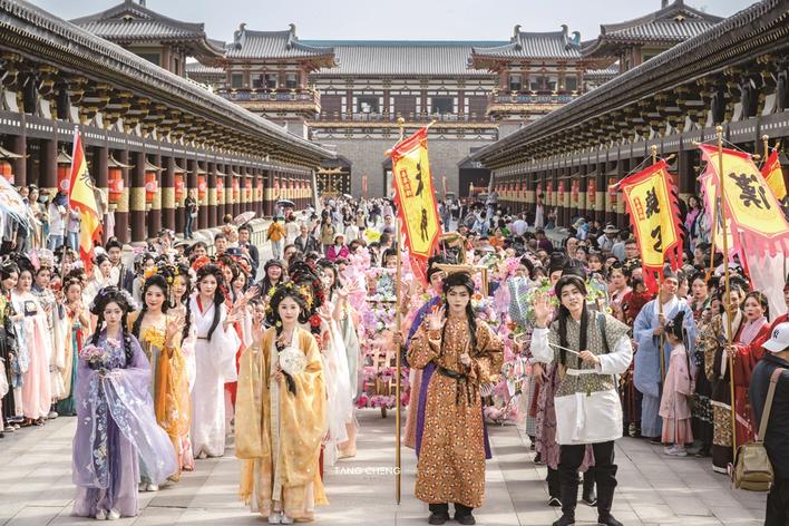 襄阳唐城景区清明假期前两日接待游客达5.8万人。景区以“唐城簪花节国风盛典”为主题,邀请了十二花神和十二位簪花郎进行特色巡游,并配合花神祭、汉服走秀等活动带领游客沉浸式体验盛唐风雅。