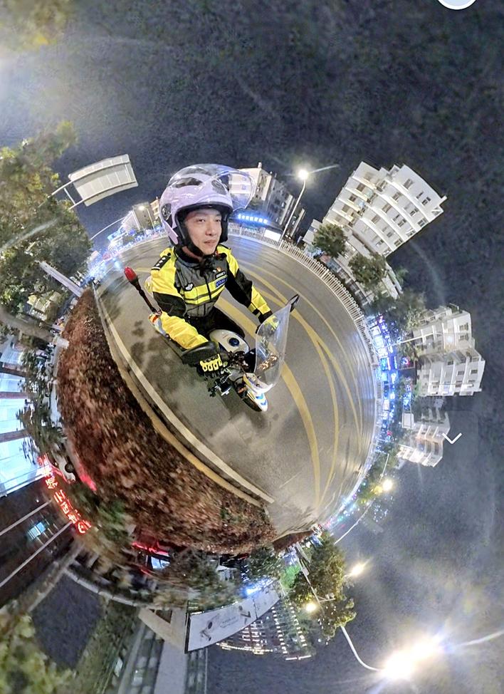 今年4月19日,央视新闻播发了他深夜巡逻时的一段视频。一个中学生晚上独自骑车回家,曾怀庆追上去问:“你是一个人骑车上学的吗?乖乖。”得知孩子头盔的扣带坏了,他立刻拿出一个备用头盔递过去,叮嘱她注意安全。孩子接过头盔,说了一句“叔叔,你真好”。那个画面萌化了无数网友,就是巡逻时视频录像的真实记录。