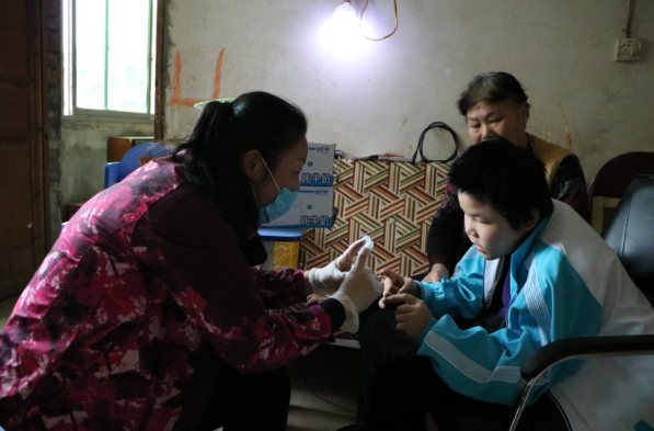 学校教师与送教上门学生一起做手指操 图片来源:鄂州市特殊教育学校