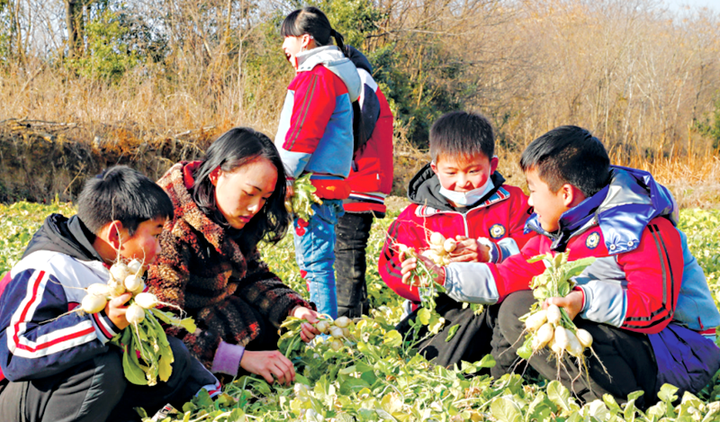 班主任和孩子们一起拔萝卜。图片来源:长江日报