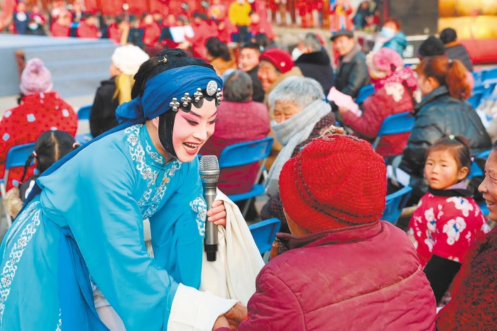 1月5日,在湖北省老河口市袁冲乡夏诗荷雨村,演员与村民互动。(通讯员 杨东 摄)