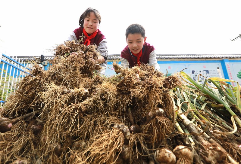 5月11日,竹山县宝丰镇黄栗九年一贯制学校学生在老师的带领下,兴高采烈地来到“校园农场”开展割油菜、拔大蒜、制作地栽金银花造型等劳动实践活动。