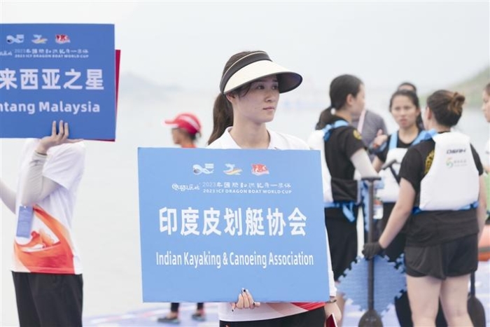 2023国际划联龙舟世界杯比赛现场,礼仪志愿服务队队员手举各代表队队牌,引导队员入场。(图片由团市委提供)